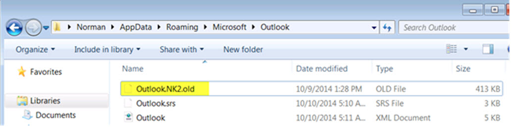 Note: The .nk2 file is renamed with a .old file name extension on the first start of Outlook 2013. Therefore, if you try to re-import the .nk2 file, remove the .old file name extension.